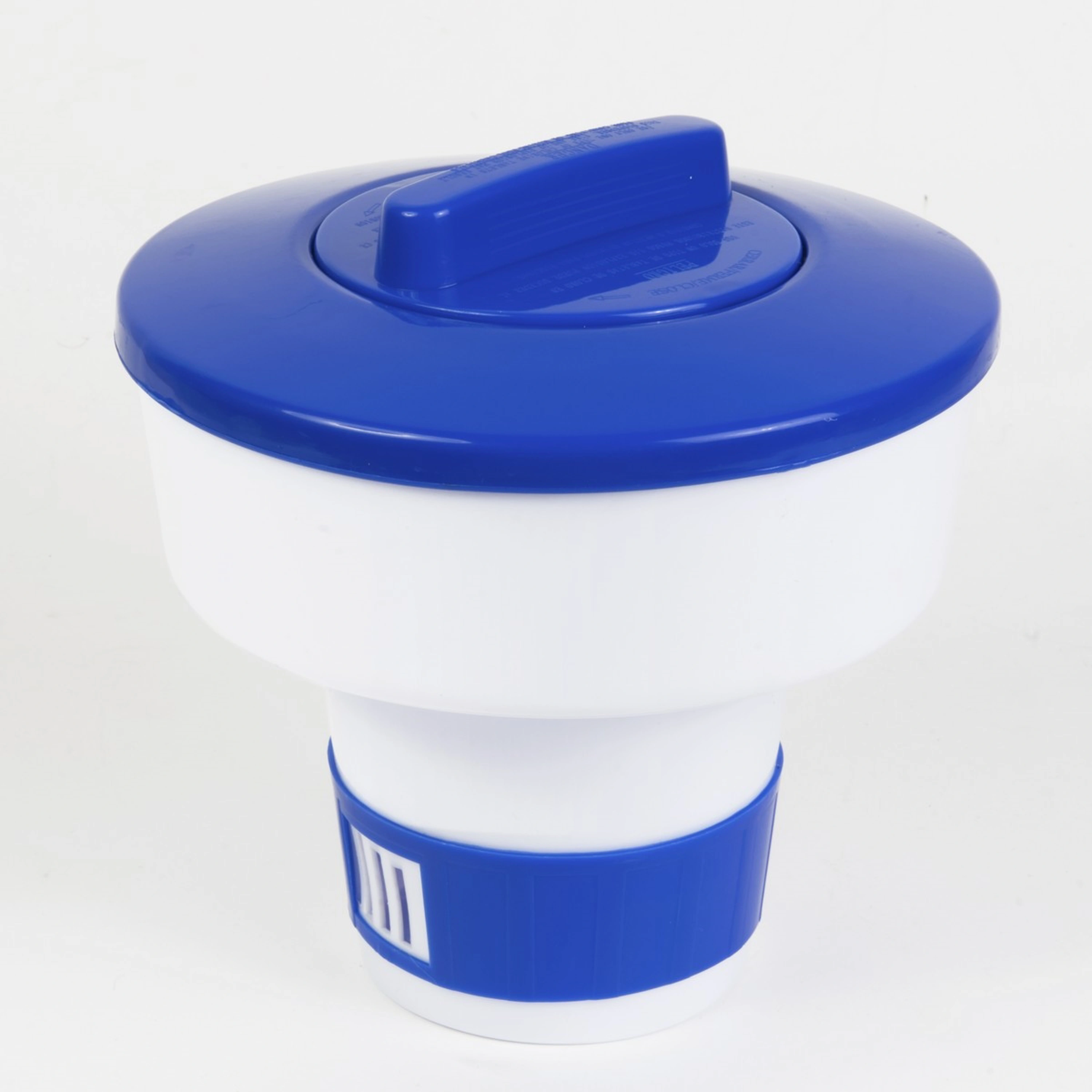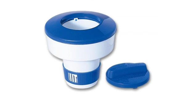 Plávajúci plastový dávkovač s regulačnou mriežkou pre chlórové tablety.