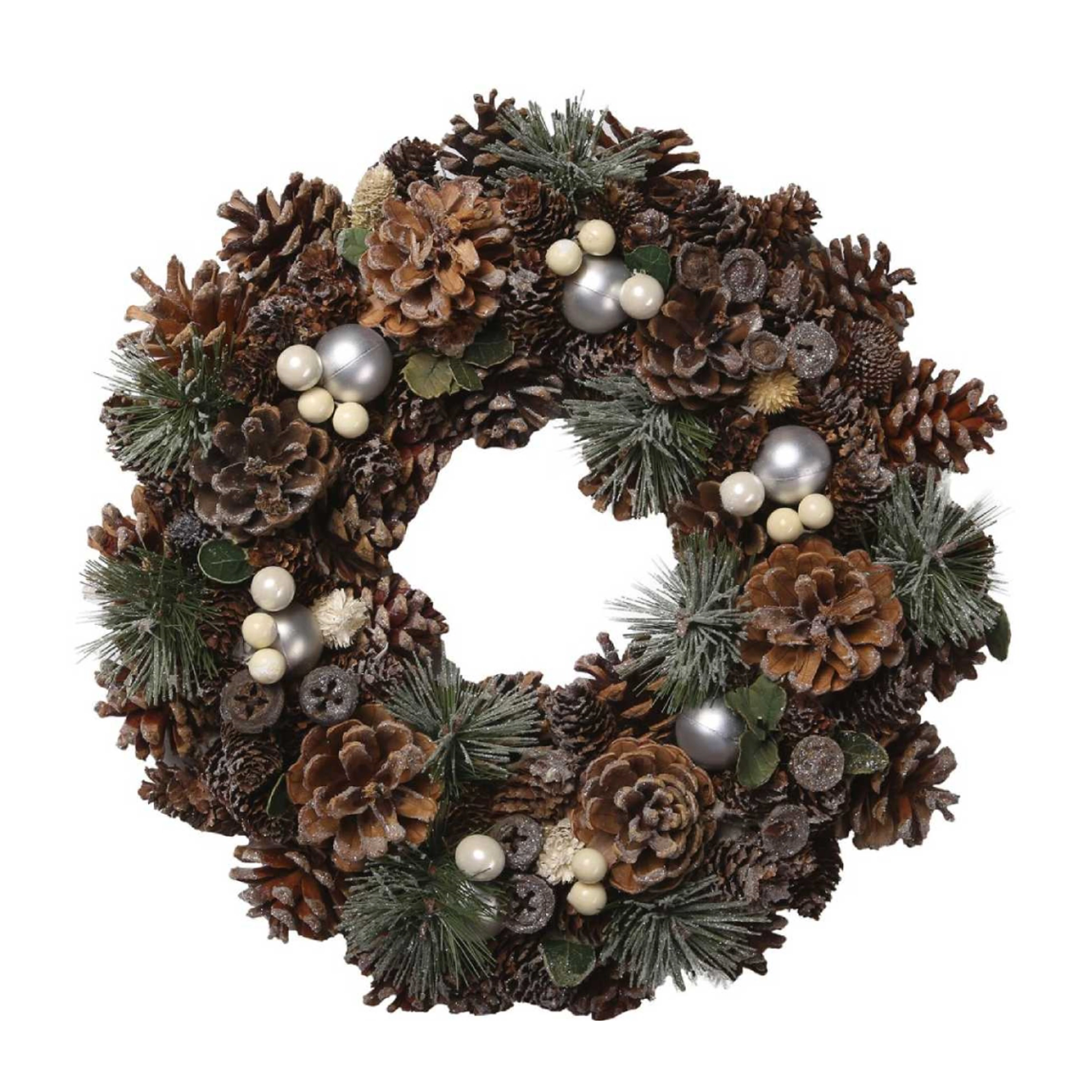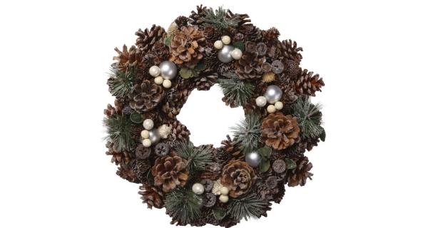 Adventný veniec zdobený šiškami a drobnými ozdobami v prírodných farbách.