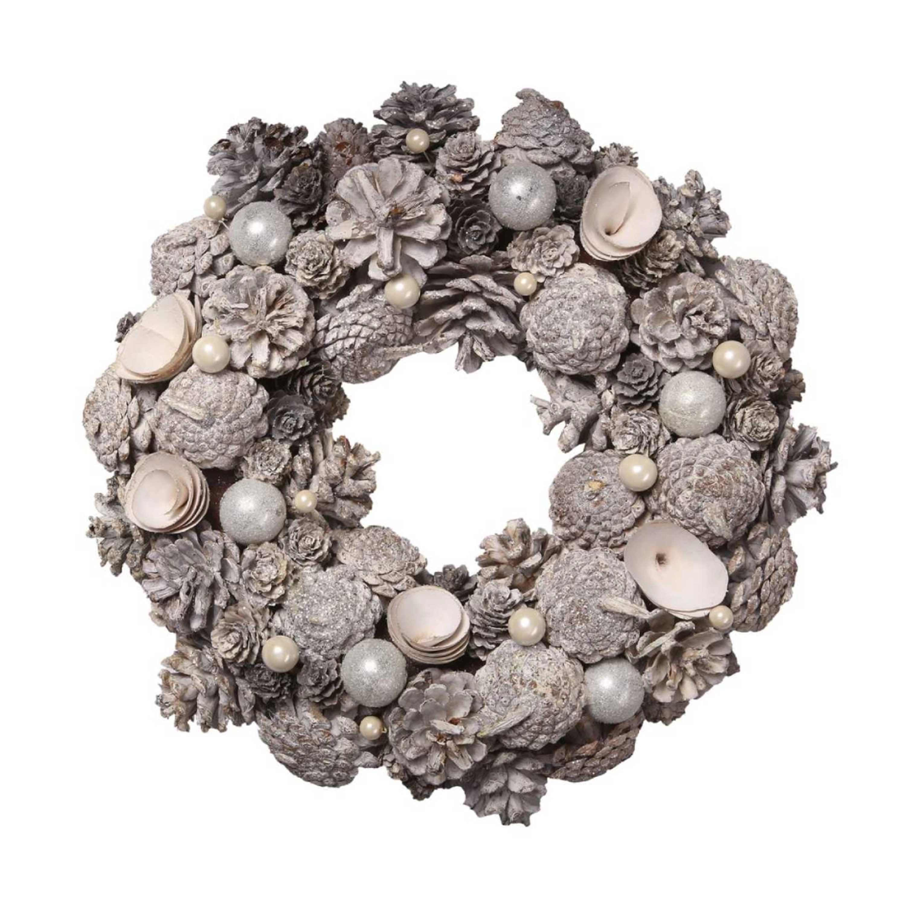 Adventný veniec zdobený farebnými šiškami a drobnými ozdobami v odtieňoch striebornej s drobnými detailami perličiek v krémovej farbe.