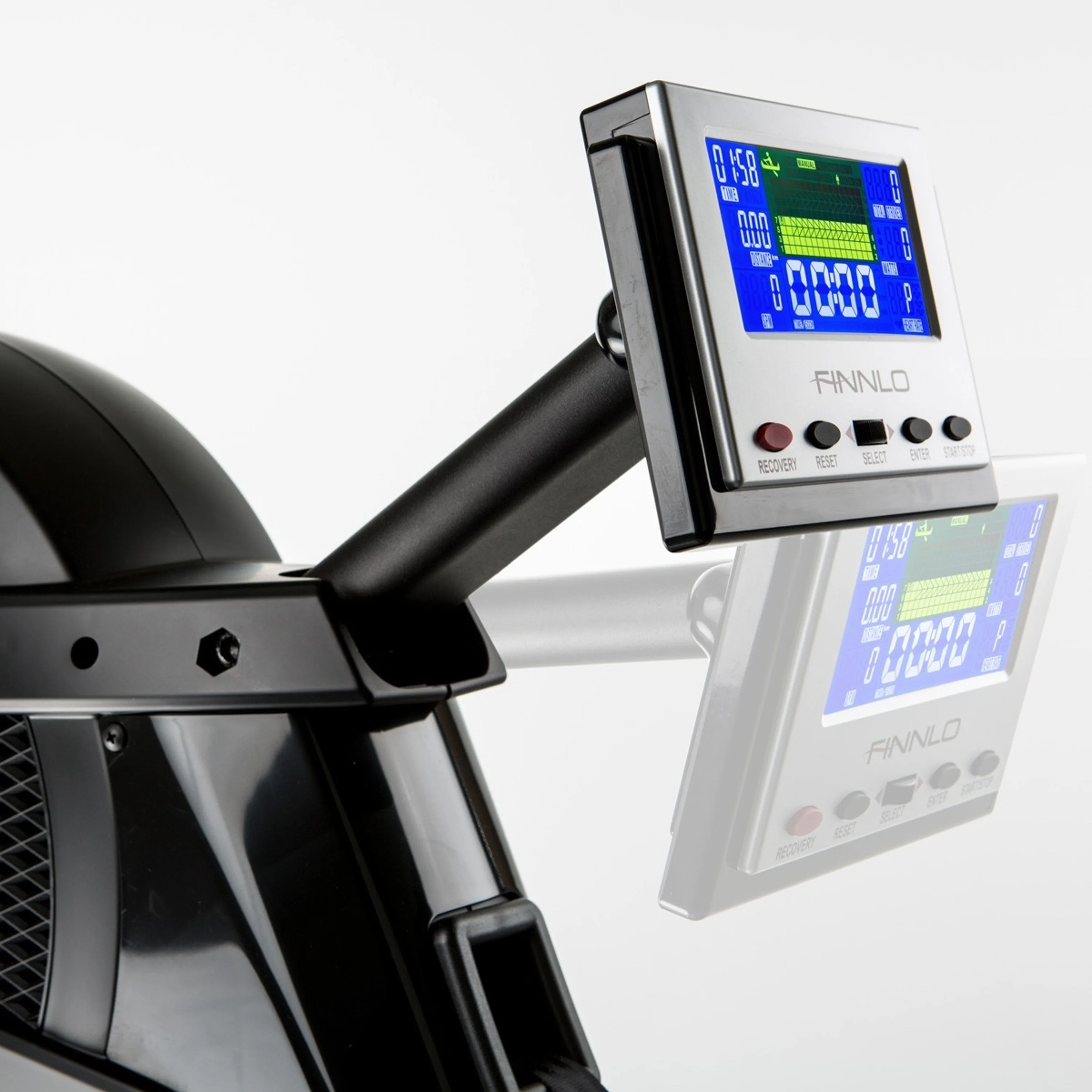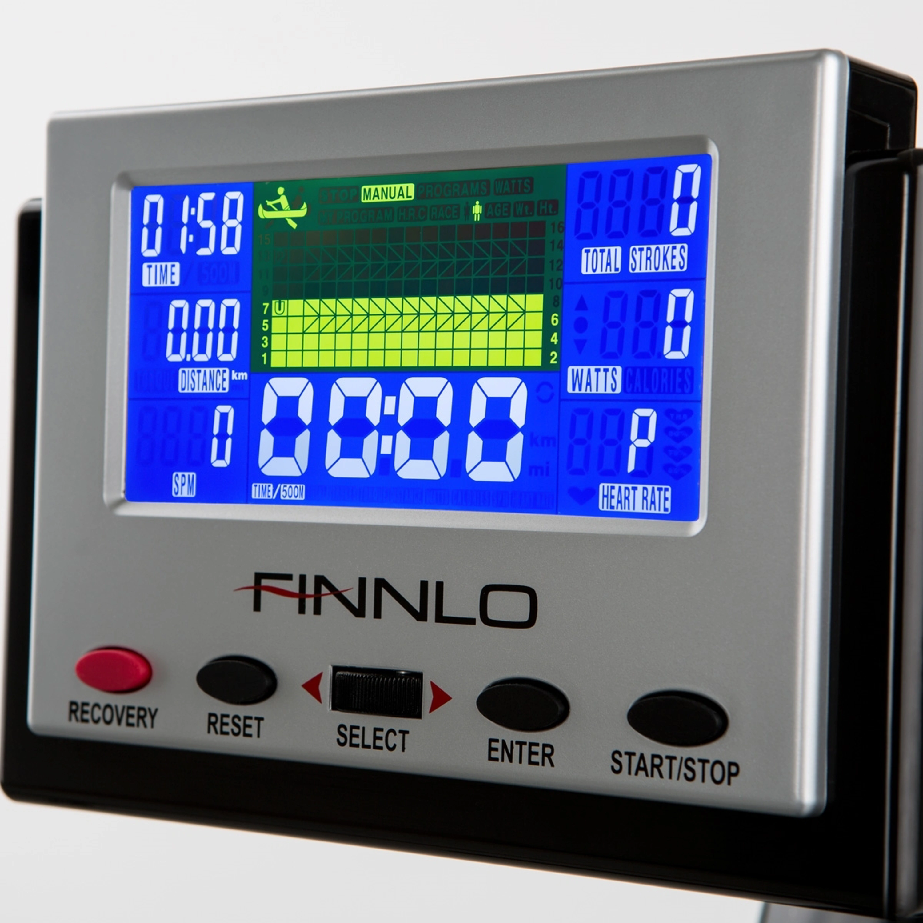 FINNLO Aquon Evolution má prehľadný LCD displej s modrým podsvietením, ktorý je možné podľa potrieb nakláňať. Tréningový počítač ponúka 8 trvalo zobrazených hodnôt. Merané údaje sú: čas, kalorická spotreba, tepová frekvencia, vzdialenosť, počet záberov, zábery/min., čas na prejdenie 500 m, watty, nastavenie hornej hranice tepovej frekvencie. Tá sa meria prostredníctvom hrudného pásu s presnosťou EKG. Hrudný pás nie je súčasťou dodávky, ale je možné ho u nás dokúpiť.
