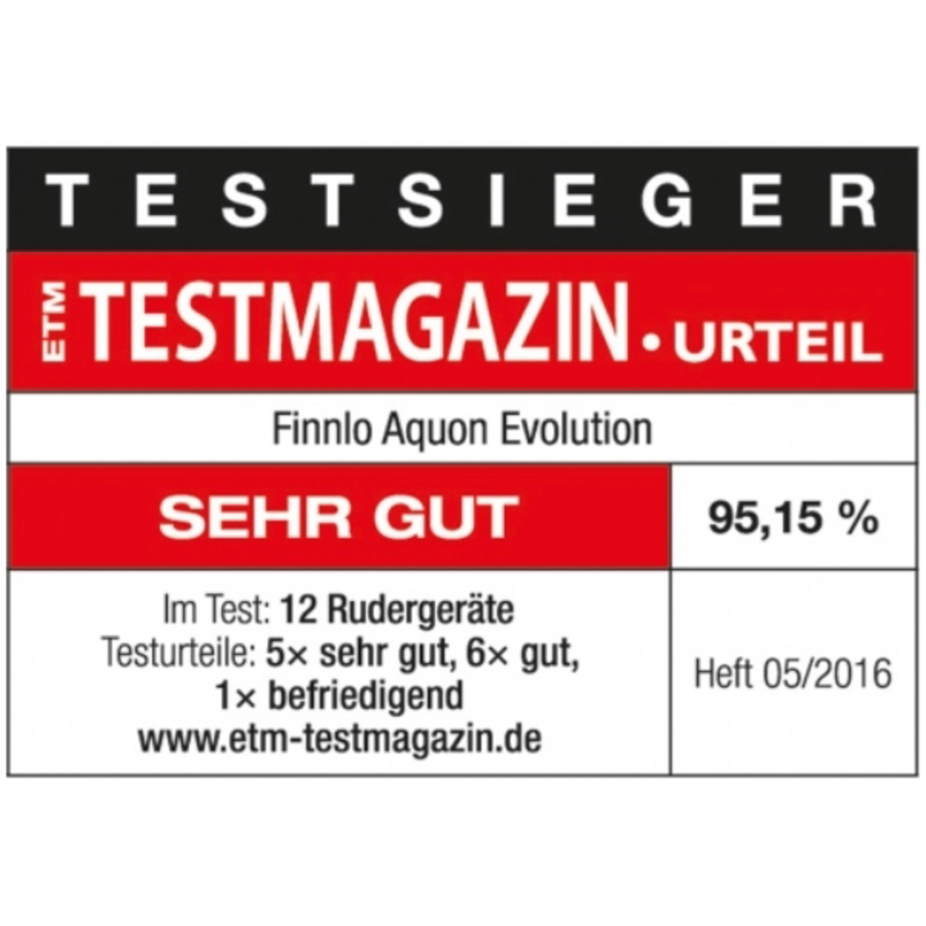 Veslovací trenažér & FINNLO Aquon Evolution získal hodnotenie "VEĽMI DOBRÝ" (95,1 %) v teste veslovacích trenažérov nemeckým časopisom Testmagazin.