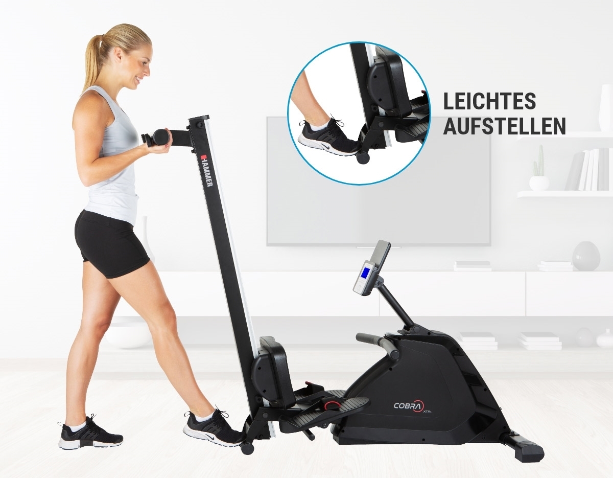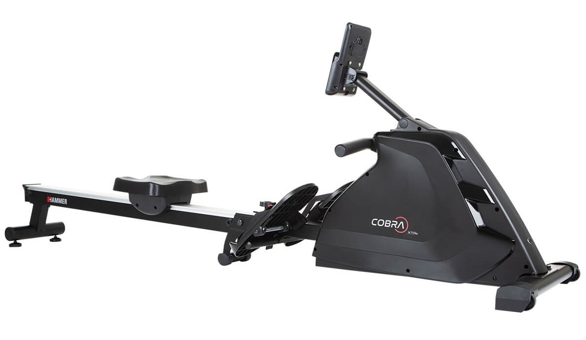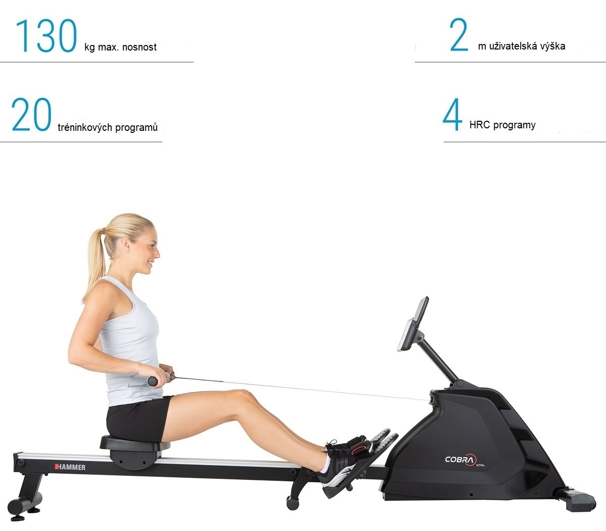 Hammer Rower Cobra XTR Plus II je skvelý veslovací trenažér určený pre domáce použitie. Vyniká hliníkovou pojazdovou lištou, pohodlným ergonomicky tvarovaným sedlom, protišmykovými nášľapmi s nastaviteľnými remienkami a praktickým tréningovým počítačom s nastaviteľným sklonom a výškou. Je vybavený tichou magnetickou brzdou, precízne prevedenou mechanikou a kvalitnými komponentmi. Vďaka zotrvačníku s hmotnosťou 8 kg má stroj úplne plynulý a komfortný chod.