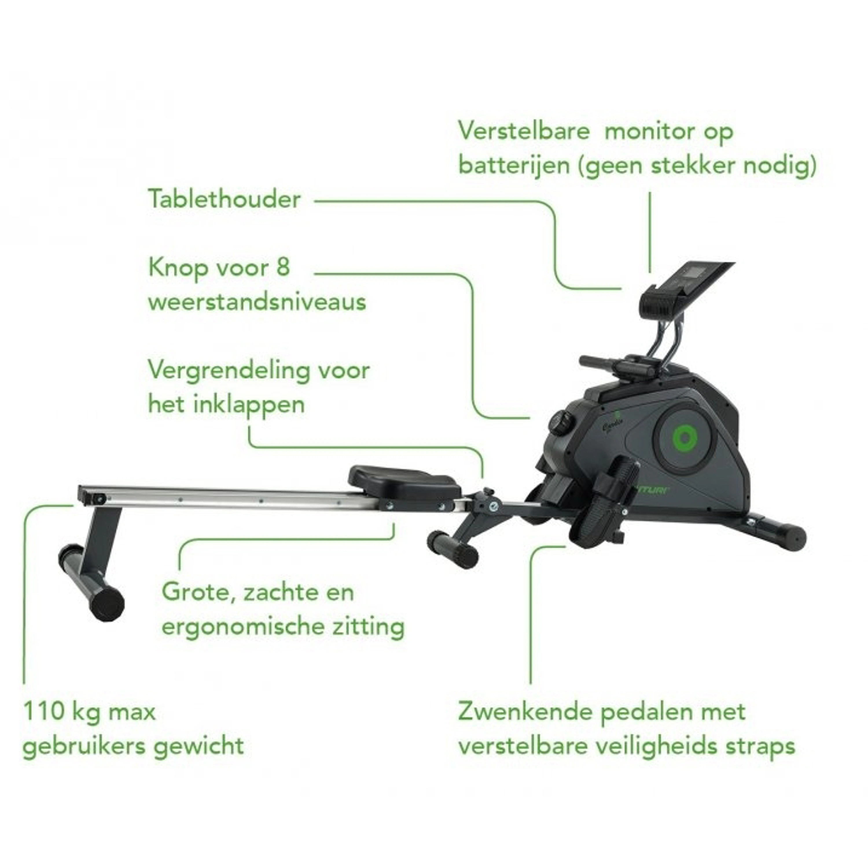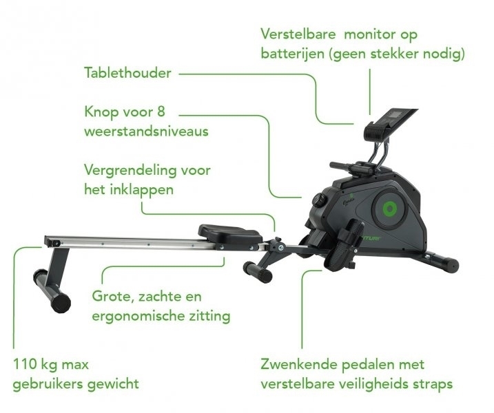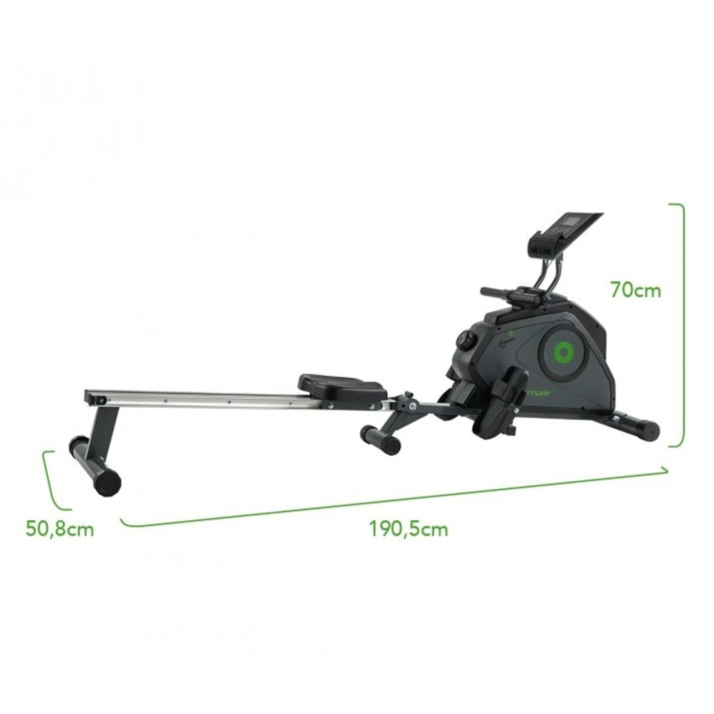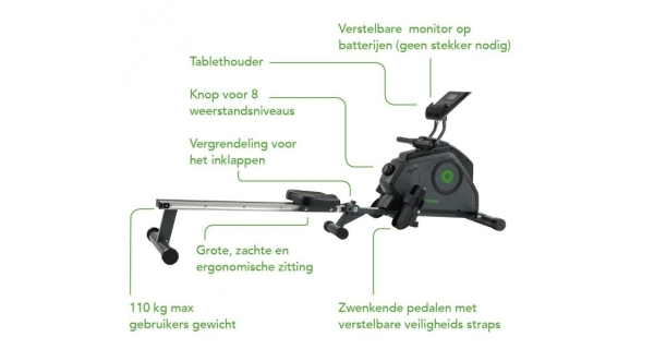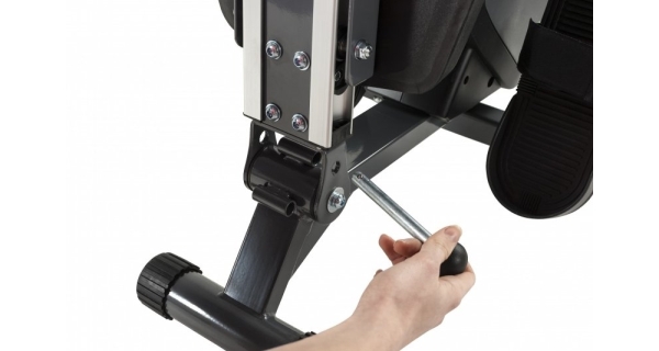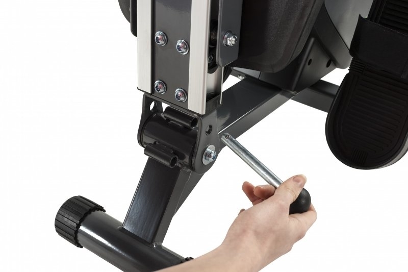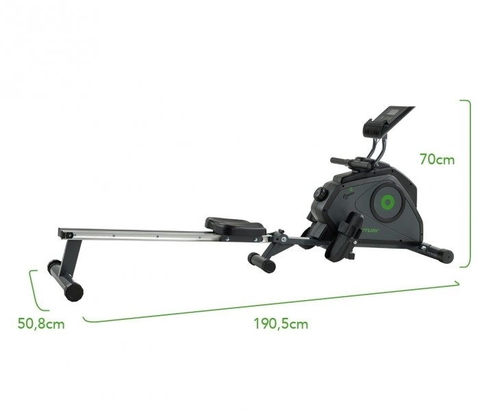 Kompaktný trenažér na domáce použitie. Skladacie koľajnice vyrobené z hliníka na pohodlné skladovanie. Držiak tabletu. Komfortné ergonomické sedlo pre ideálnu pozíciu pri veslovaní.