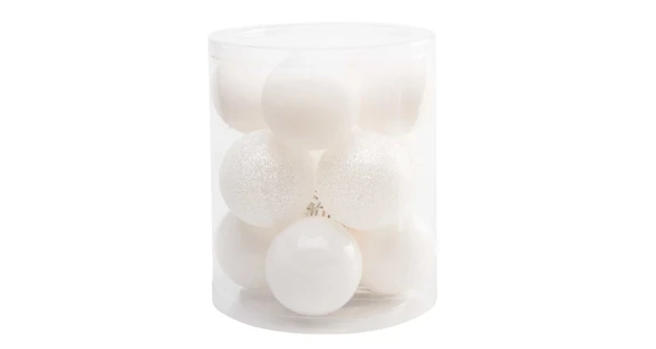 Tento set obsahuje 12 kusov vianočných gúľ v bielej farbe.