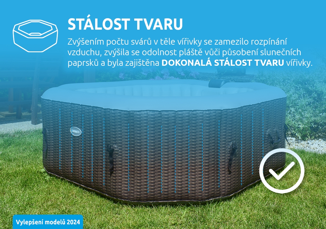 Pokiaľ je stena alebo horný okraj vírivky vydutý alebo nadmerne veľký, je to spôsobené rozpínaním vzduchu vo vnútri stien, a to buď v dôsledku nadmerného nafúknutia, alebo nadmerného vystavenie priamemu slnečnému žiareniu. Keď sa vzduch v dôsledku slnečného žiarenia zahrieva, sú dodatočne namáhané vnútorné zvary, čo môže viesť k ich poškodeniu. Uistite sa, že je vírivka Aquamar zakrytá a nie je používaná na priamom slnku. Tlakomerom sa tiež uistite, že nie je pretlakovaná a prípadne regulujte tlak upustením vzduchu.