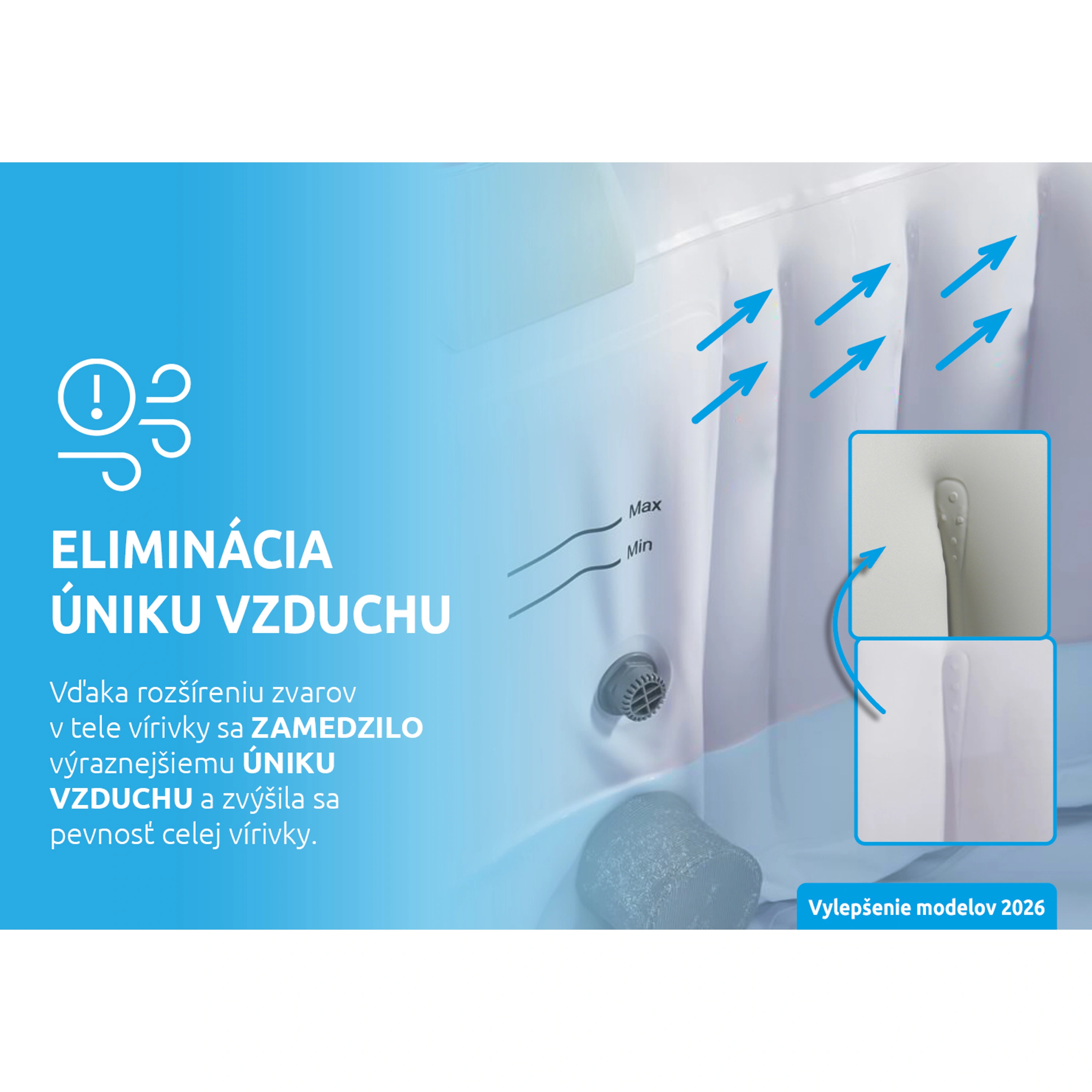 Je úplne bezpečné používať vírivku Aquamar s vypuklou stenou alebo o nadmernej veľkosti, odporúčame však upustiť malé množstvo vzduchu, aby sa za horúceho počasia mohol vzduch rozpínať. Opatrné povolenie vypúšťacieho ventilu o malý kúsok umožní pomalé uvoľnenie vzduchu. Upozorňujeme, že plášť sa nevráti do pôvodného tvaru. Vírivku nafukujte iba na 90-95 % objemu, najmä za teplého alebo horúceho počasia. Vírivka by mala byť stále mäkká na dotyk, aby sa vzduch mohol rozpínať.