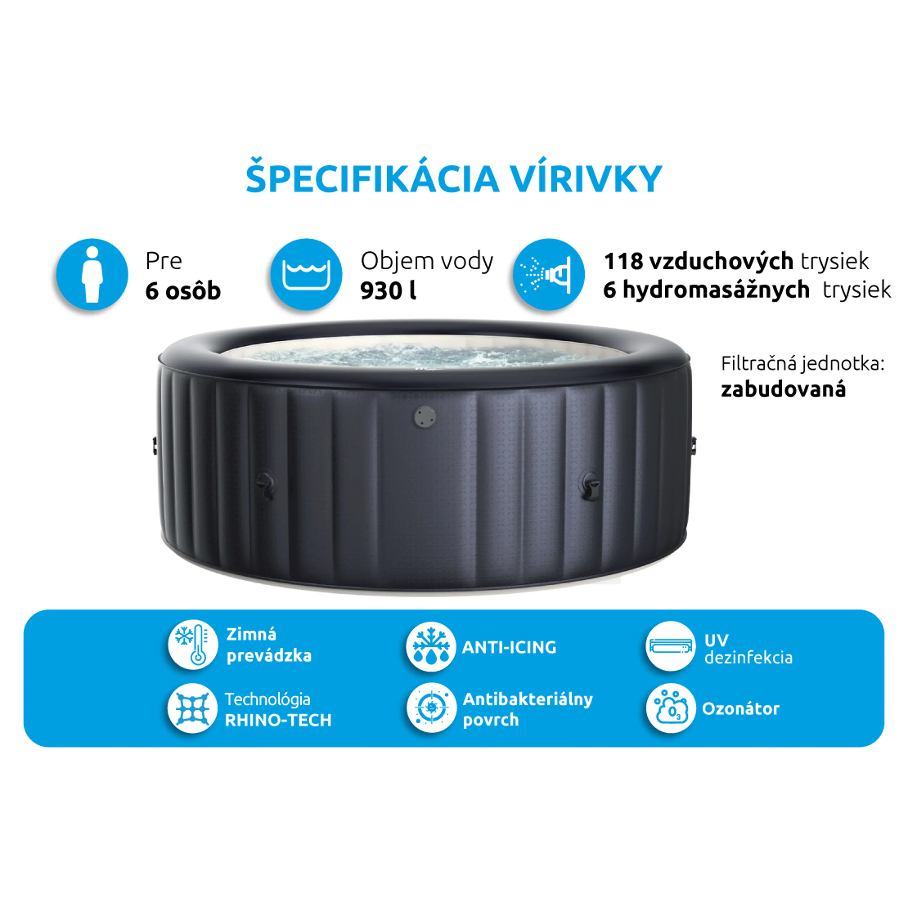 - Trysky: 118 vzduchových trysiek + 6 Hydro-jets trysiek
