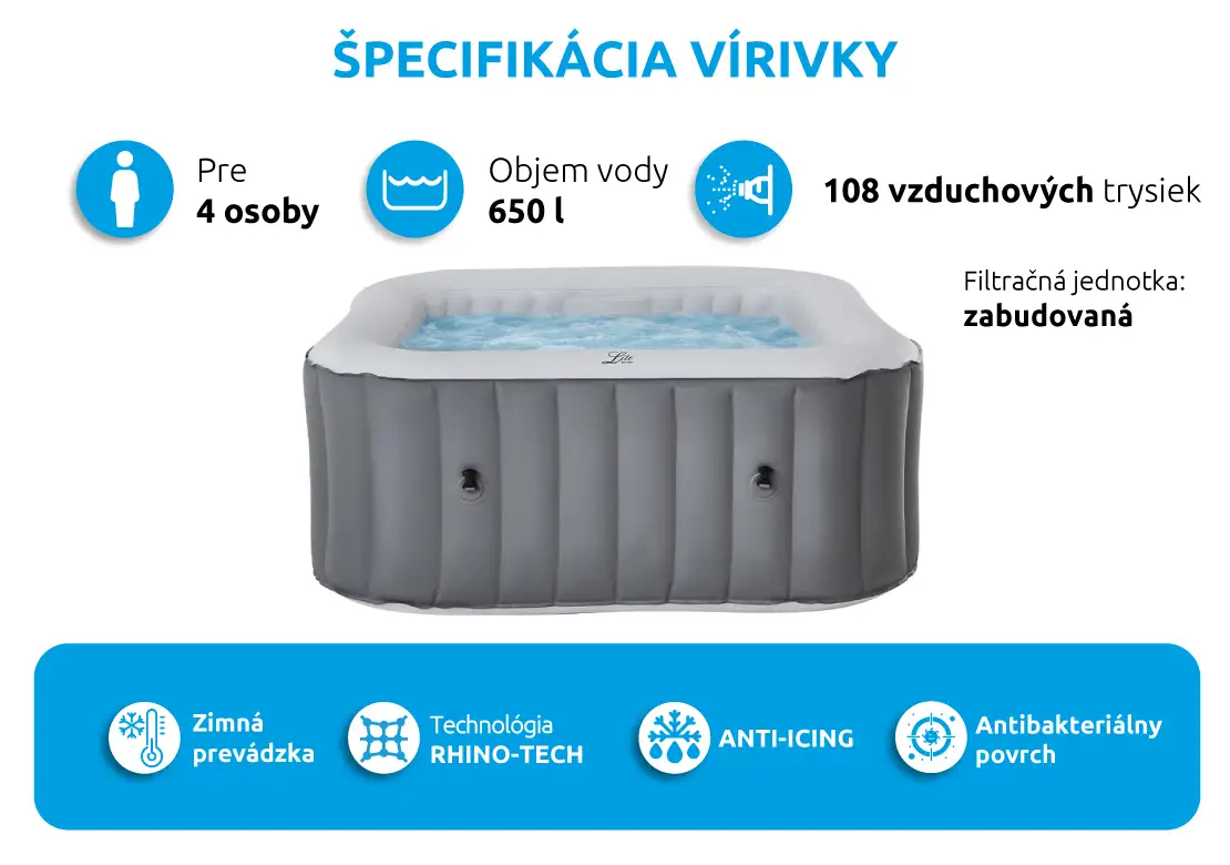 - Pokročilý samonafukovací systém – nafúkne vírivku za pár minút bez pumpy alebo externého kompresora