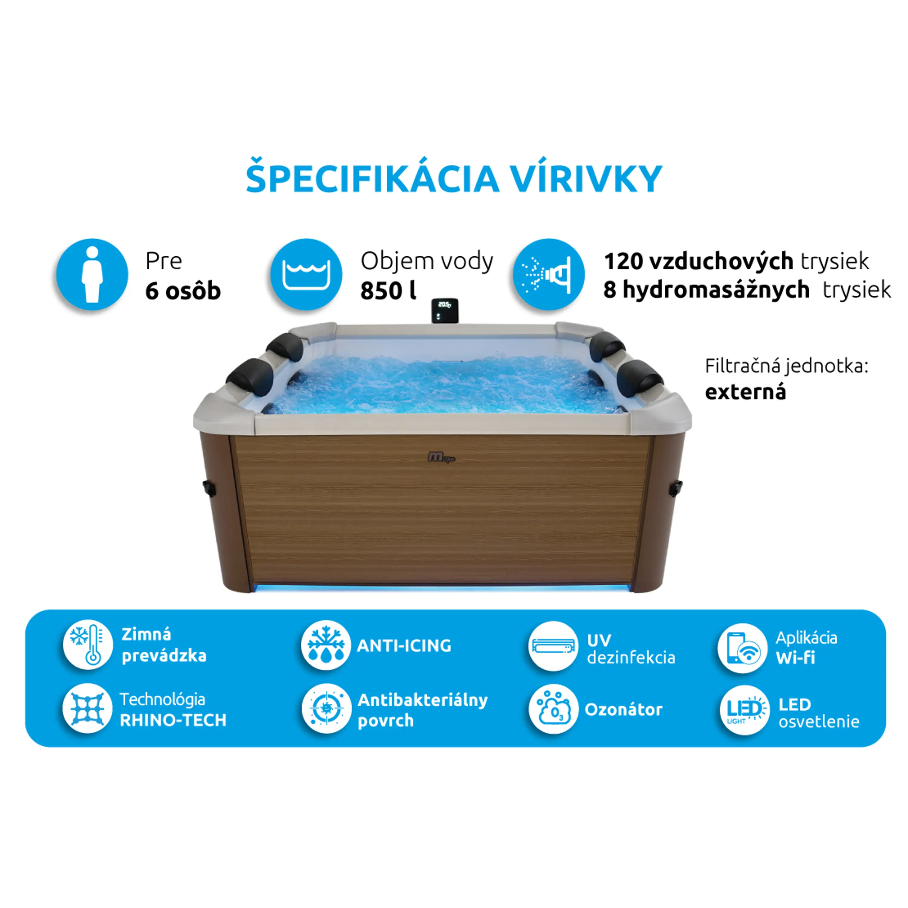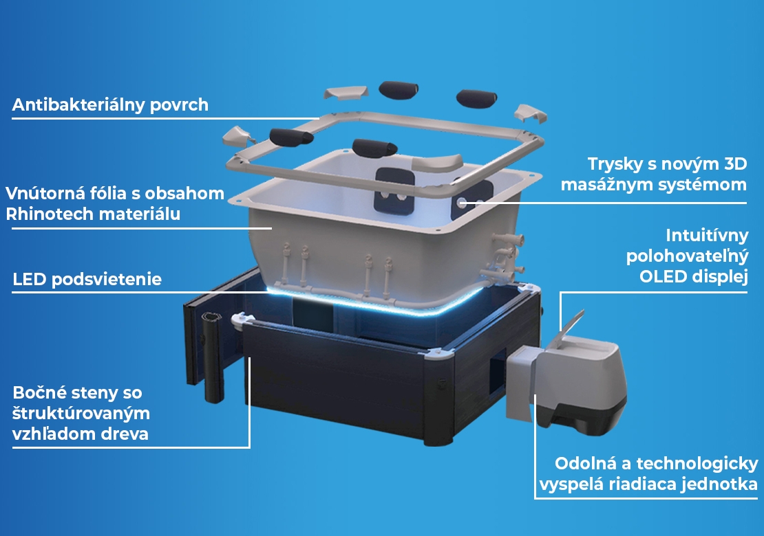 - Trysky: 120 vzduchových trysiek + 8 nastaviteľných hydromasážnych trysiek