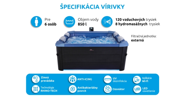 - Trysky: 120 vzduchových trysiek + 8 nastaviteľných hydromasážnych trysiek