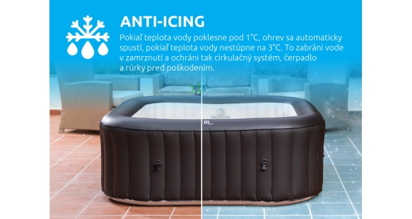 Systém ANTI-ICING bude neustále dohliadať na vašu vírivú vaňu a strážiť bezpečnú úroveň teploty. Pokiaľ teplota vody poklesne pod 1°C, ohrev sa automaticky spustí, pokiaľ teplota vody nestúpne na 3°C. Toto zabráni vode v zamrznutí a ochráni tak cirkulačný systém, čerpadlo a rúrky pred poškodením.