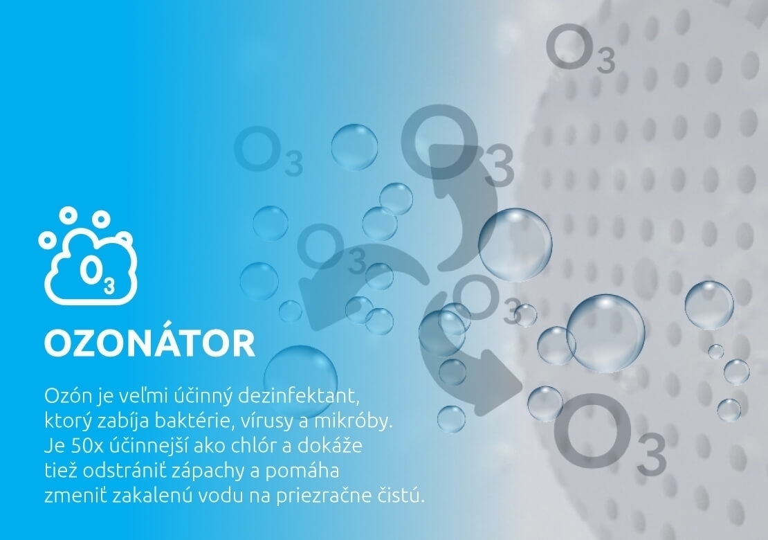 Jednoducho zapnite ozónový generátor stlačením tlačidla Ozone na ovládacom paneli pred použitím vírivky alebo po ňom. Udržíte tak svoju vírivú vaňu a seba počas relaxácie v perfektnom stave. Ozón je veľmi účinný dezinfektant, ktorý zabíja baktérie, vírusy a mikróby. Je 50x účinnejší ako chlór a dokáže tiež odstrániť zápachy a pomáha zmeniť zakalenú vodu na priezračne čistú.