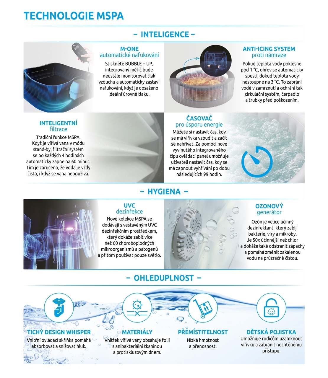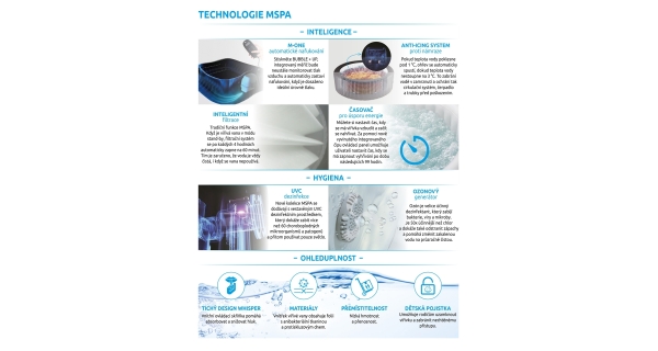 V riadiacej jednotke je zabudovaná mini sterilizačná komora s UVC LED lampou, ktorá zabezpečuje, že každá kvapka vody v Mspa je pod neustálou ochranou - bez ohľadu na to, či sa v nej ľudia kúpu alebo nie. Testy ukázali, že táto lampa dokáže zničiť 52 % baktérií za 4 hodiny. UV lampa LED nemôže poškodiť vaše oči ani pokožku, pretože je úplne uzavretá vo vnútri čerpadla. Na rozdiel od UVA alebo UVB žiarenia UVC nemá vplyv na životnosť. Vlnová dĺžka UVC žiarenia je starostlivo nastavená tak, aby neovplyvňovala životnosť ostatných častí kúpeľa. Spotreba tohto systému UVC je veľmi nízka.