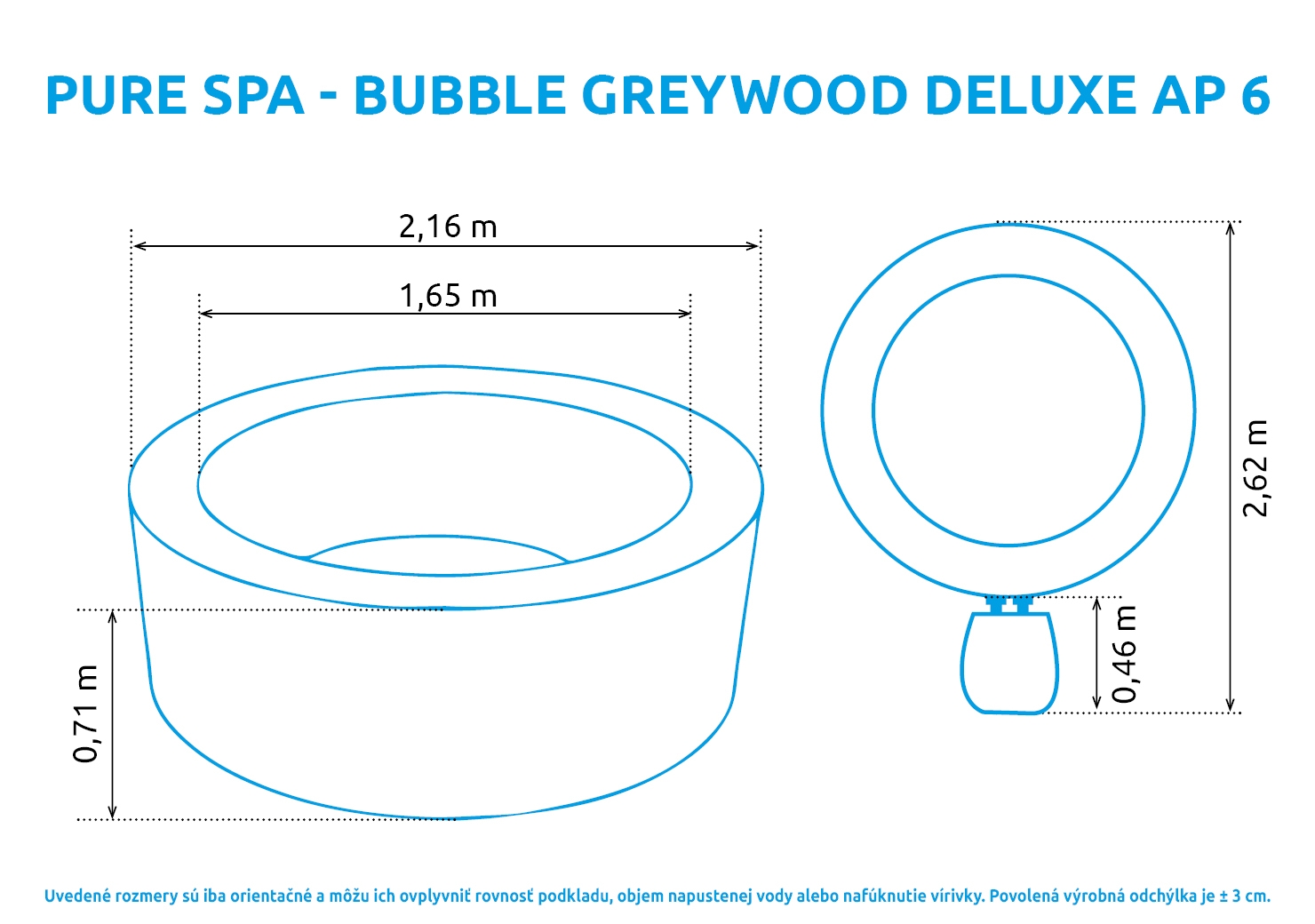 Vírivý bazén Pure Spa - Bubble Greywood Deluxe AP 6 disponuje novou funkciou WIFI na spárovanie a ovládanie vírivky pomocou mobilného telefónu. Ďalším benefitom je systémom HWT na zmäkčovanie vody poskytuje dokonalú relaxáciu. Vďaka jej rozmerom je vhodná až pre šesť osôb. Vírivka má 170 vysoko výkonných bublinkových trysiek, ktoré masážou povzbudia každý sval.