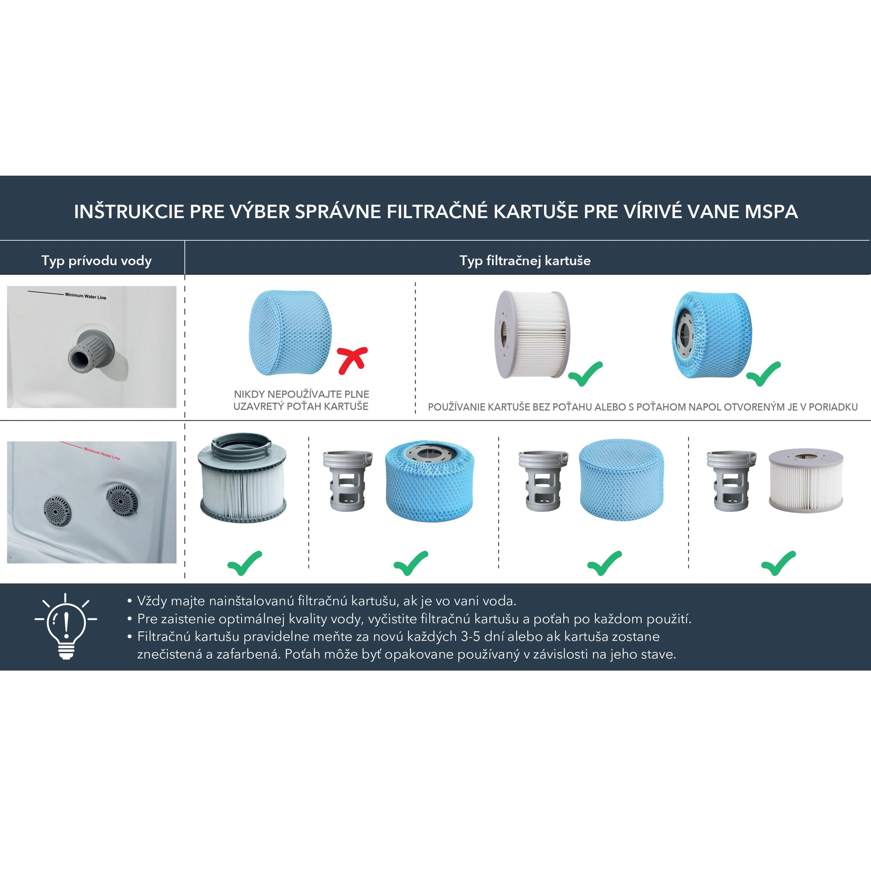 MSpa originálne kartušové filtrácie pomáhajú odstrániť nečistoty, prach a inú špinu. Naše filtre merajú 7 cm na dĺžku a 10,5cm v priemere. nasadzujú sa jednoduchým pootočením priamo na filtračnú prírubu vo vnútri vírivky.