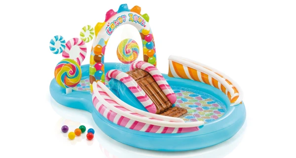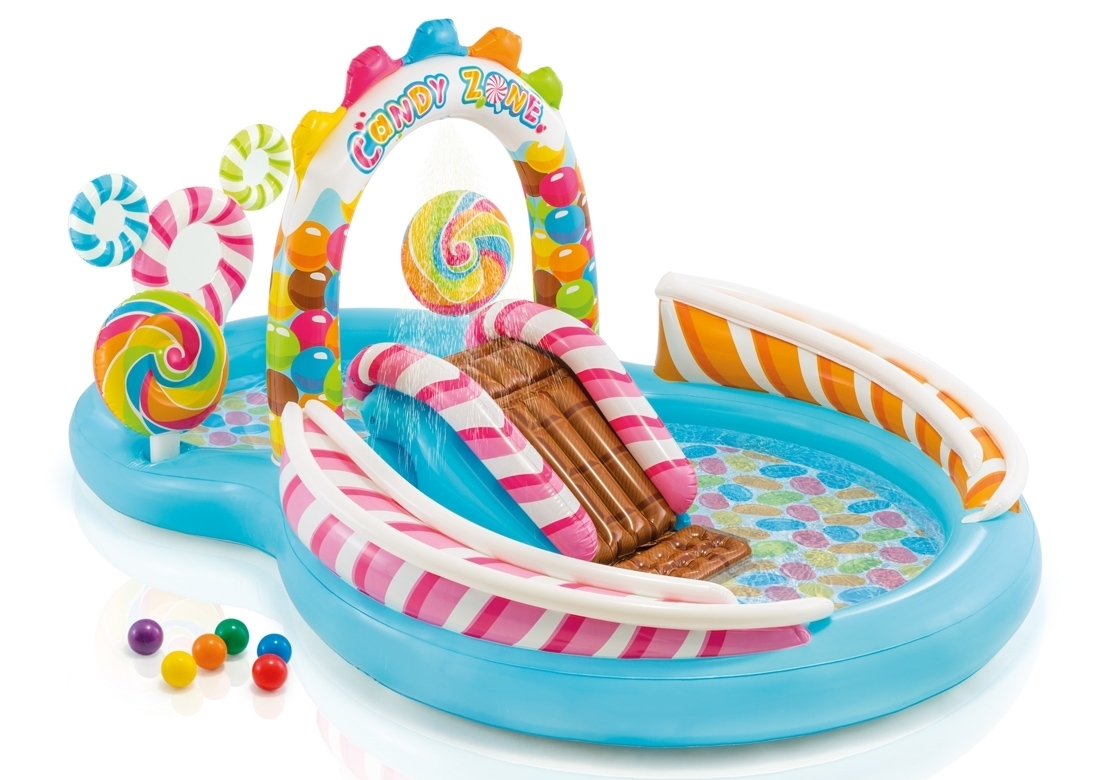 Nafukovacie hracie centrum s dvoma bazénmi a motívom cukríkov, so šmykľavkou, sprchou, dvoma nafukovacími lízankami a šiestimi loptičkami.