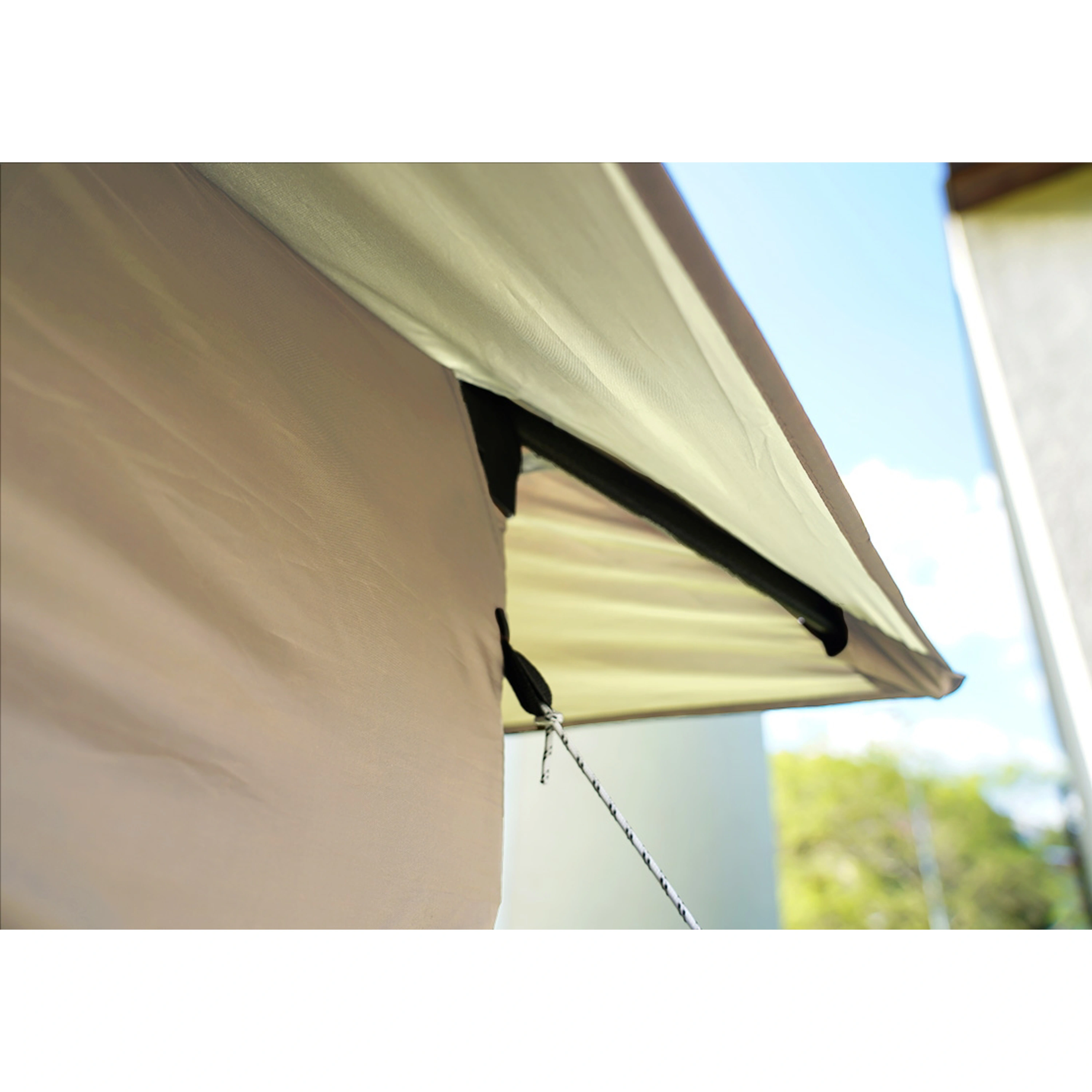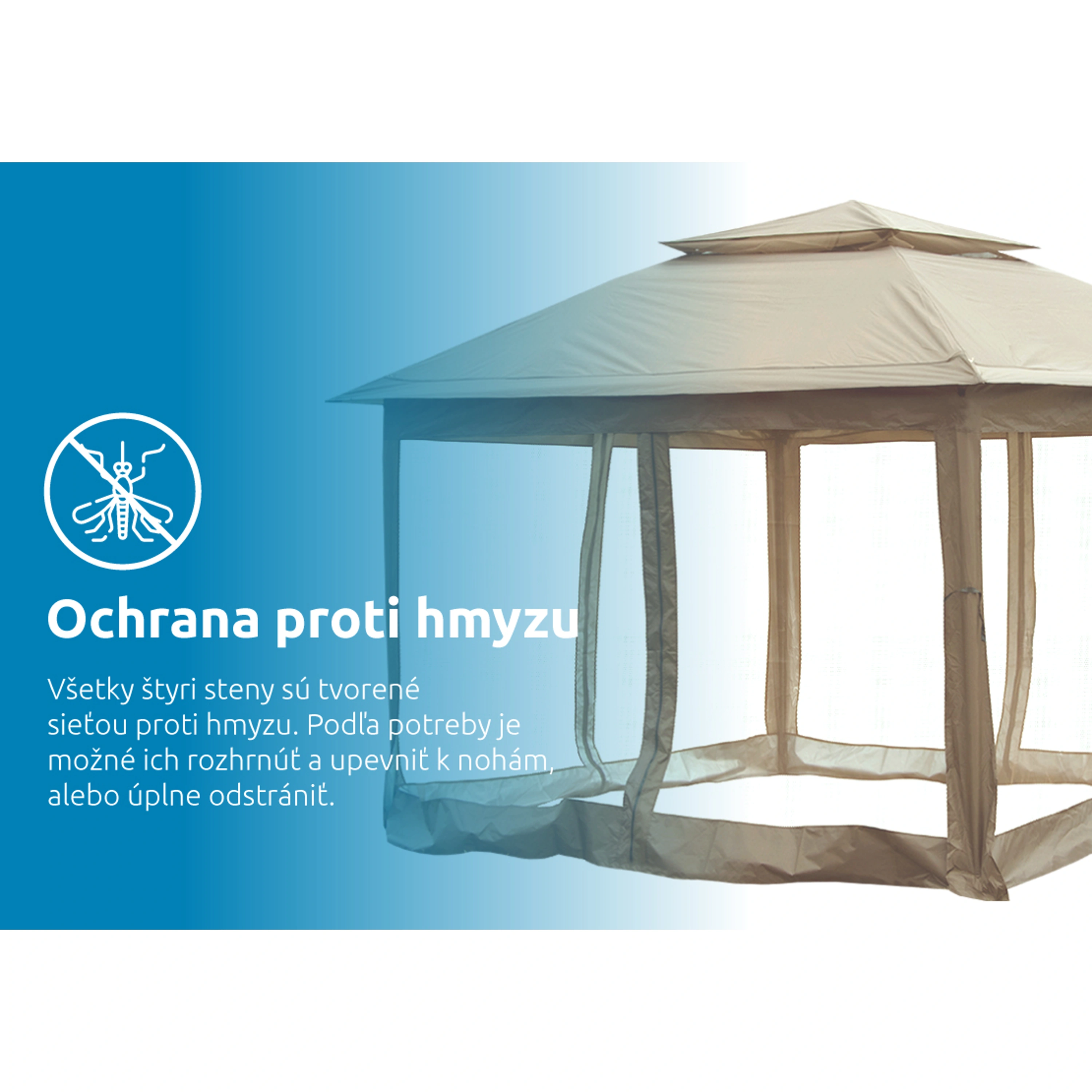 Materiál, z ktorého je textília altánku vyrobená, chráni proti negatívnemu pôsobeniu UV žiarenia a zároveň je vodeodolný. Poskytne tak vám aj vašim veciam dostatočnú ochranu pred slnkom aj dažďom. Všetky štyri steny sú tvorené sieťou proti hmyzu.