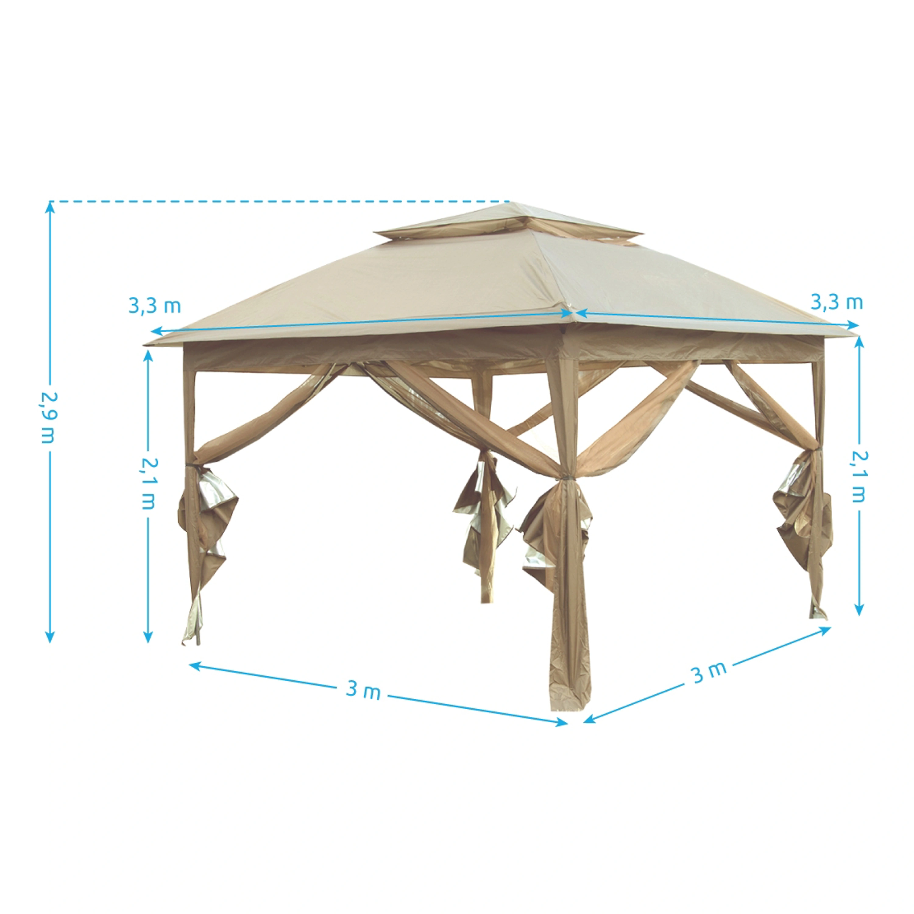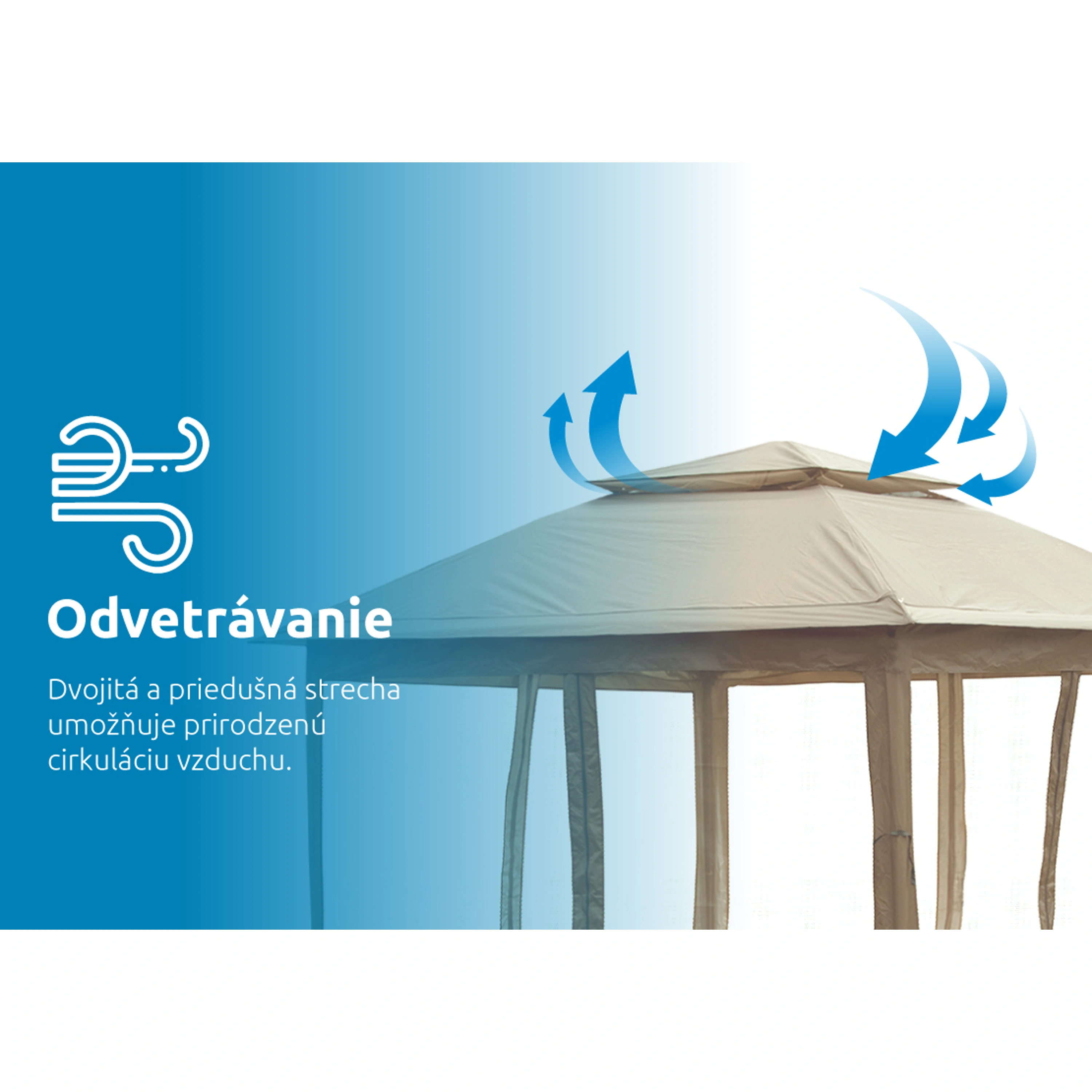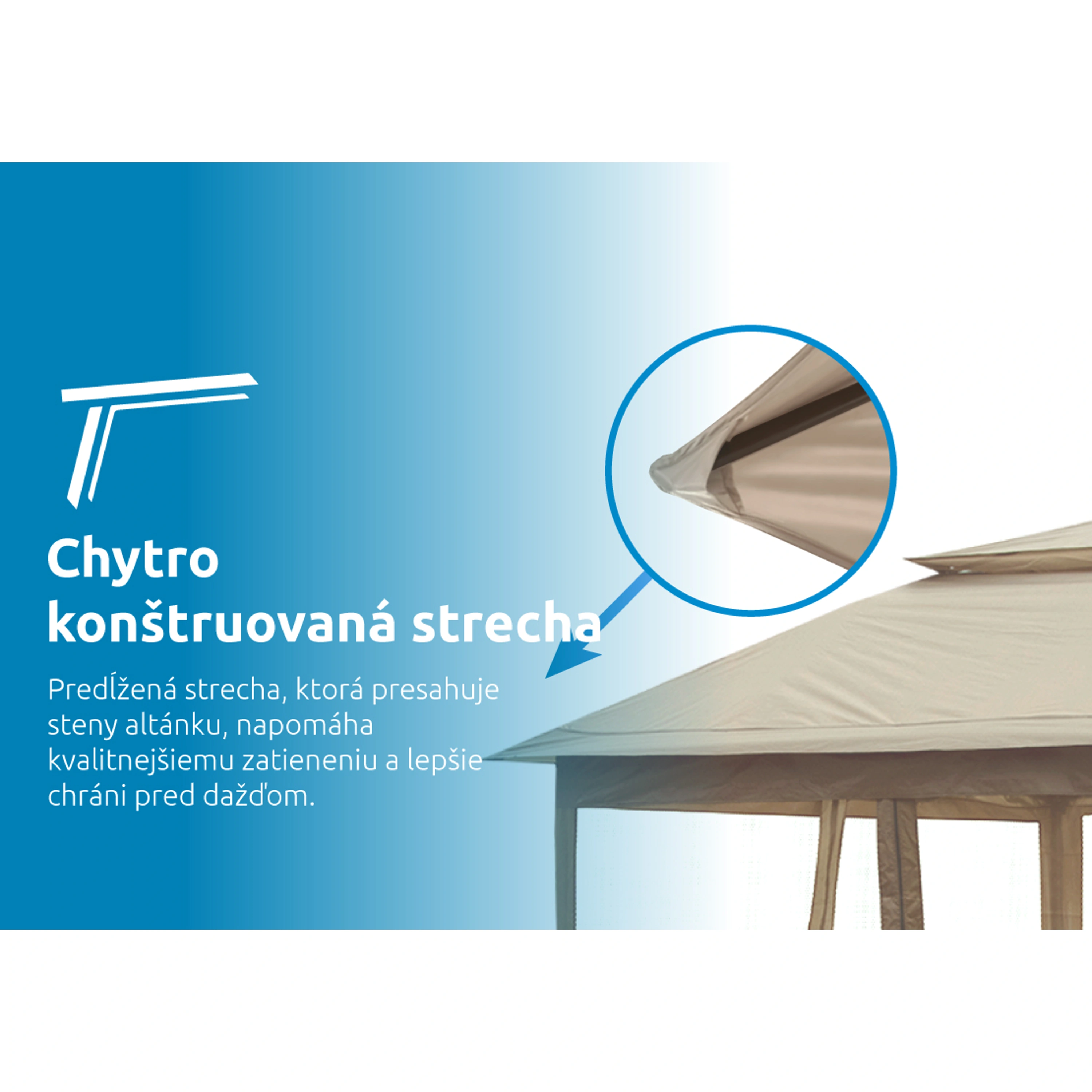 Predĺžená strecha, ktorá presahuje steny altánku, napomáha kvalitnejšiemu zatieneniu a lepšie chráni pred dažďom. Zdvojená a priedušná časť vrcholu strechy umožňuje prirodzenú cirkuláciu vzduchu. Celá konštrukcia je tvorená pevným rámom z ocele s práškovým náterom. Vďaka tomu je altánok veľmi stabilný.