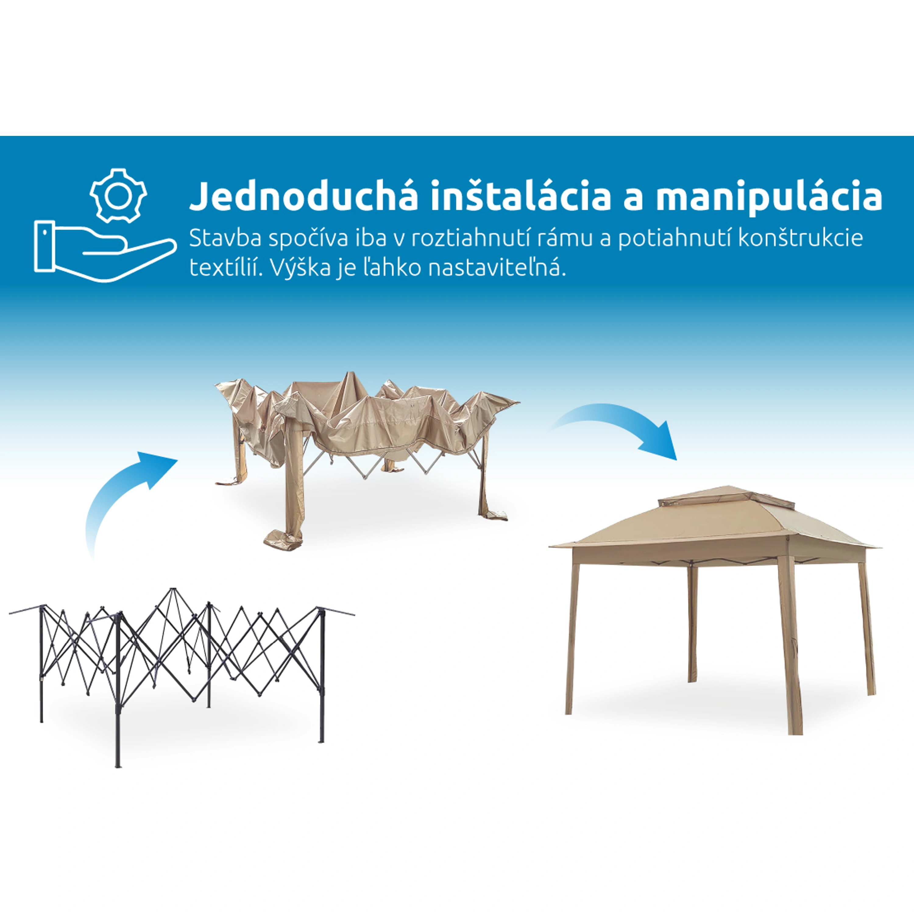Stavba altánku spočíva iba v roztiahnutí rámu a potiahnutí konštrukcie textílií.