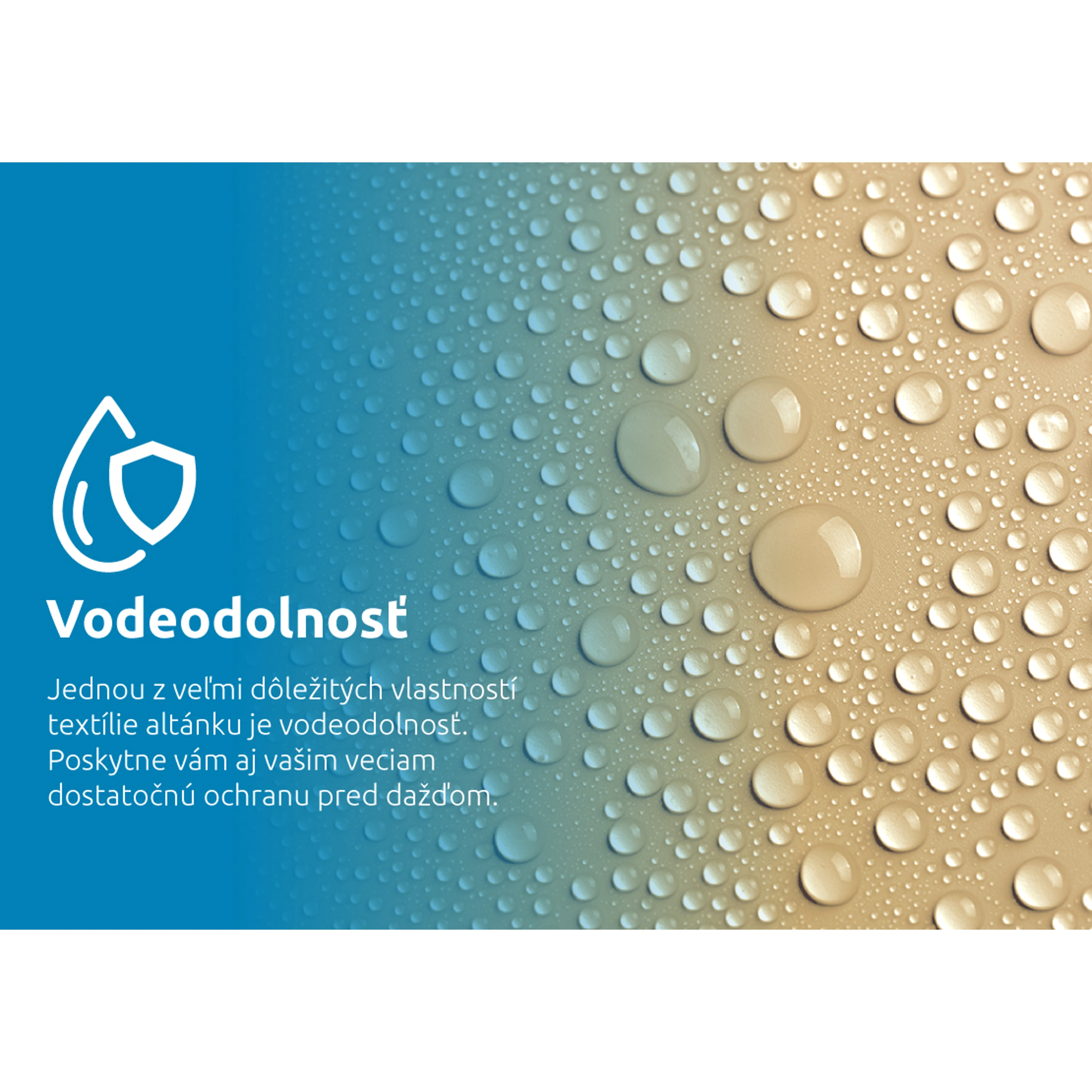 Vodeodolný materiálJednou z veľmi dôležitých vlastností textílie altánku je vodeodolnosť. Poskytne vám aj vašim veciam dostatočnú ochranu pred dažďom. |