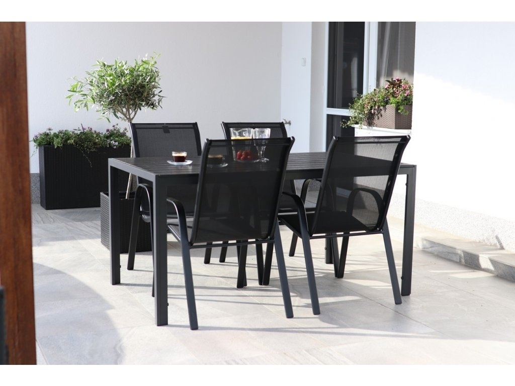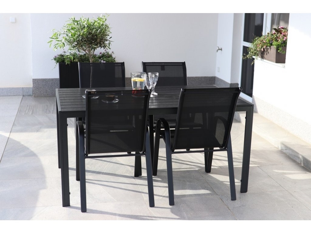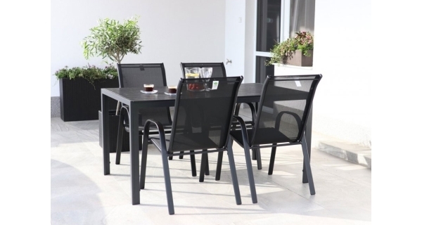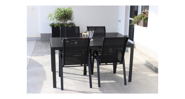 Zostava zahŕňa krásny a ľahký stôl vyrobený z materiálov, ktoré nevyžadujú zvláštnu údržbu. Konštrukcia z hliníka ošetreného proti hrdzi, doska stola z Artwoodu a adaptéry na nohách pre väčšiu stabilitu. Klasické tvary a čierne prevedenie stola.