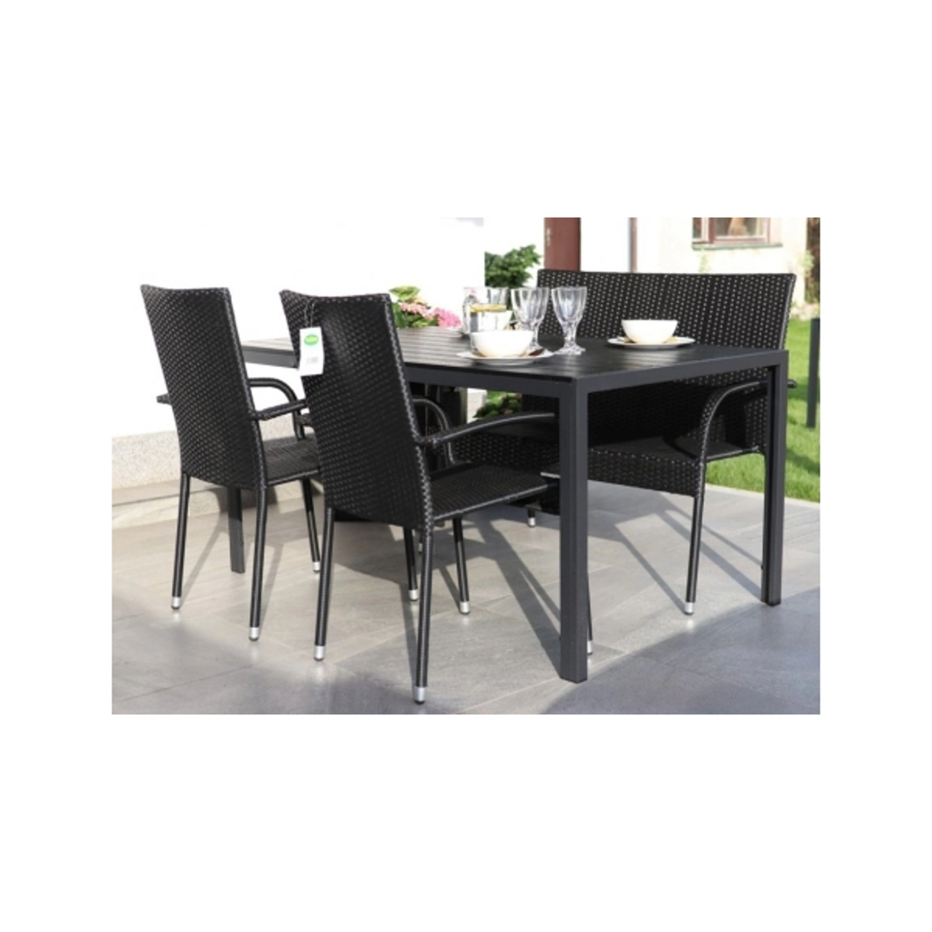 Ďalšie dve miesta na sedenie ponúka ľahká lavica PARIS s oceľovou konštrukciou a výpletom z umelého ratanu. Vďaka použitým materiálom má lavica navyše vysokú nosnosť. Zostava je vhodná do vonkajších aj vnútorných priestorov.