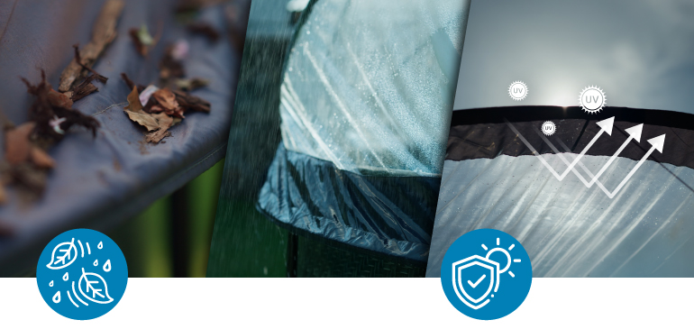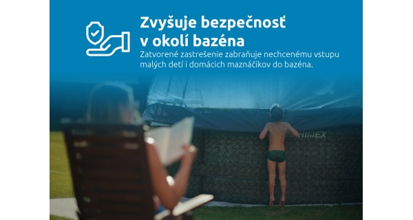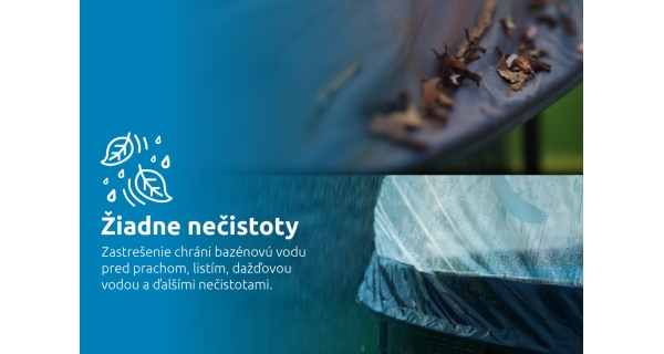 Ochrana bazéna aj vodyZastrešenie chráni vodu v bazéne pred nečistotami a znižuje tepelné straty. Zabraňuje tiež priamemu pôsobeniu UV žiarenia na materiál bazéna a vodu. |
