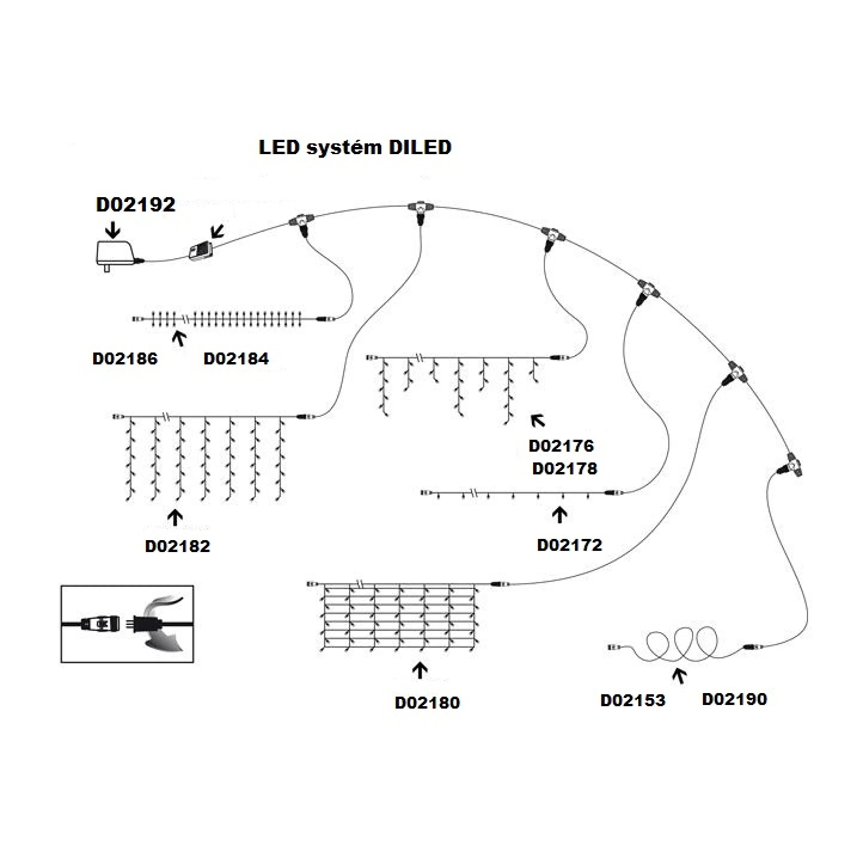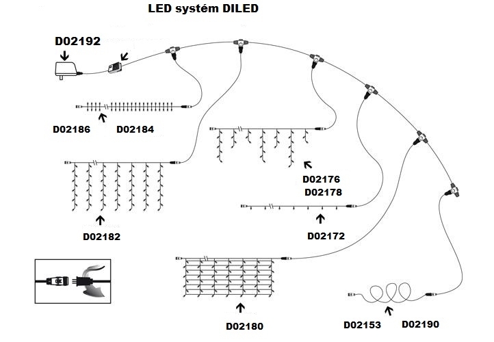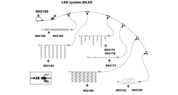 Reťaz je vhodná ako pre vonkajšie, tak aj pre vnútorné použitie. Na jeden napájací adaptér môžete napojiť až 2 000 diód v rámci diLED systému.